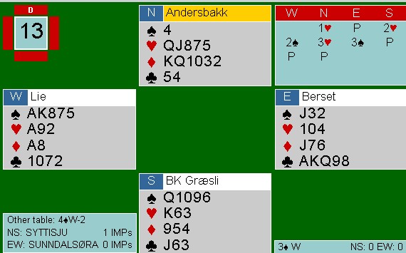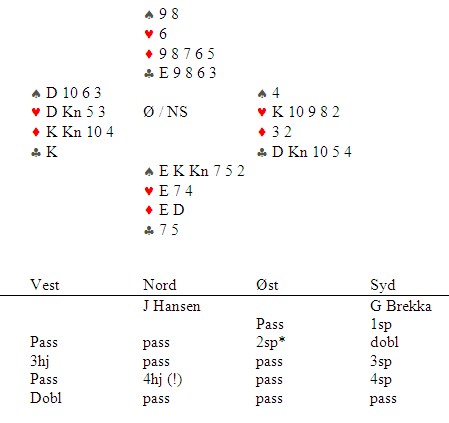 2sp fra øst viste hjerter og kløver, mens resten var naturlig. Hvis 4hj fra Ivrig i nord kan kalles naturlig da. Han mente å vise litt spar og ruterfarge. Hva jeg mener om vest sin dobling, får du ikke høre. Annet enn at opplysende doblinger på 4-trinnet sjelden er lurt. Det blir en anelse lettere å være spillefører når motparten er så snill å fortelle deg hvordan det sitter. Et typisk eksempel på at i jakten på 200 i stedet for 100 ble prisen -790 i stedet.
