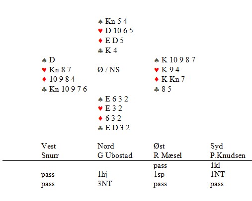 Spar ut fra Hilmar Frønningen ble sluppet til hånden og liten kløver spilt til kongen i N. Ny spar til damen og ny liten kløver vant N med damen. Nok en spar og Per Even Melby hadde sakeproblem og valgte å vise styrke med ru 3. Det ble senere straffet, for Eva tok kl A og spilte hjerter til esset , tok for kl J og så ruter til kongen og ny ruter der N gikk opp og dro med seg ru A hos makker. Hilmar regnet ikke med sak fra bare 3- kort hos makker. Resten sto, 10 stikk ga selvsagt ren topp.