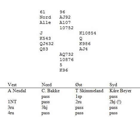 Nå lot han ruter dame løpe, og fortsatte med hjerter. Vest stakk med tieren og fortsatte med damen, men Frank var på høyden. Han kastet spar fra bordet. Nå kom spar som ble stukket med esset, en spar ble stjålet og den siste sparen forsvant på ruuter ess. Etter det var det bare å ta ny trumffinesse, og kontrakten var i havn.