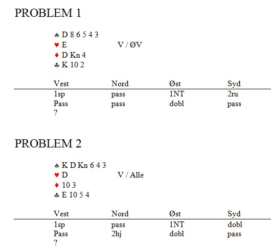 Bridgen forandrer seg. Ikke minst når det gjelder bruk av doblinger. Mange posisjoner som tidligere var opplagte straffedoblinger, spilles i dag som opplysende. Betyr dette at motparten skal få boltre seg ustraffa? Under er to spill fra gårsdagens rundekamp. Begge vesst sine pass i andre runde kan sikkert diskuteres, men du har vært aktuell og har nå fått muligheten til å straffe motparten i stedet for å være i 2sp. Eller dette er kanskje ikke straff? Hva melder du? (Logg på og svar i kommentarfeltet)