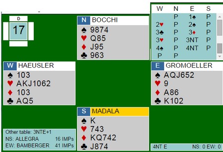 Tor åpnet med 1 hjerter og Eva doblet opplysende! Det lover jo åpning, 11+ poeng og spar så 9 hp med sparfarge var klar overmelding. Jan P meldte så 1 spar og Tormod som med 11 poeng nok så at her var noe rart på gang nøyde seg med å melde 1 grand. Da ingen hadde mer å tilføye ble det sluttbud. Selv med gunstig plassering av majorkongene var det ikke mulig å vinne, men 1 sonebet kostet jo bare 100 ut. Ved de andre bordene var Ø spillefører i 1 NT og alle hadde fått minst 8 stikk, +120-210 (11 stikk!) var notert for ØV.