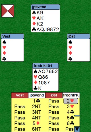 Jeg liker å bakspille på BBO. Det er en annen idrett å se alle korta enn å bare kunne skue ned på sine egene tretten, så når par får til slike fine ting, ser jeg at det er lurt å ha system og det er lurt å trene. Jeg mener ikke at mange andre par ikke kunne klart å komme til 6NT i nord på denne hånda, men uansett fint å se på.