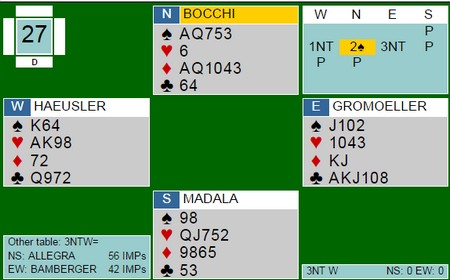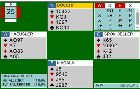Begge to fikk ruter ut og italienske Duboin tok dobbelfinessen i hjerter for sitt niende stikk. Tyskeren Heusler prøvde seg på en artistisk variant og gikk beit.