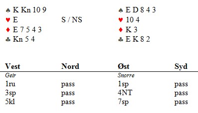 Jeg skulle nok meldt 3NT over 3sp. Da tipper jeg Geir går ned i 4sp med minimum for 3sp og da legger jeg meg kanskje til på 6-trinnet?