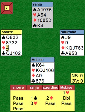 Når syd fulgte med ruter 9, visste jeg hele fordelingen. 3-5-2-3. Hjerteren var tett og hun kunne stjele neste ruter, ta ut trumfen, spar konge og spar til kapp for ni.