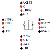 Hj 10 kom ut og jeg gjorde et dumt trekk ved å dekke med knekten. 10-er ut er oftere topp av «ingenting» og plasserer damen. Nå drepte V knekten med damen og ikke noe var avgjort, men nå måtte mye mer løse seg. Etter hj A tok jeg ut trumf ved sp J og ny til damen. Ø sakte hjerter i 3. stikk. Finner jeg kl J direkte kan slemmen vinnes med tre stikk, og jeg valgte kløver til 8-er. Da den dro esset var det for sent å spille ruter. Jeg stakk jo, spilte kl 9 som fikk seile og deretter sp D som rensket trumfen. Så kl K og inntak på hj A til stående kl D ga avkast av ru D.