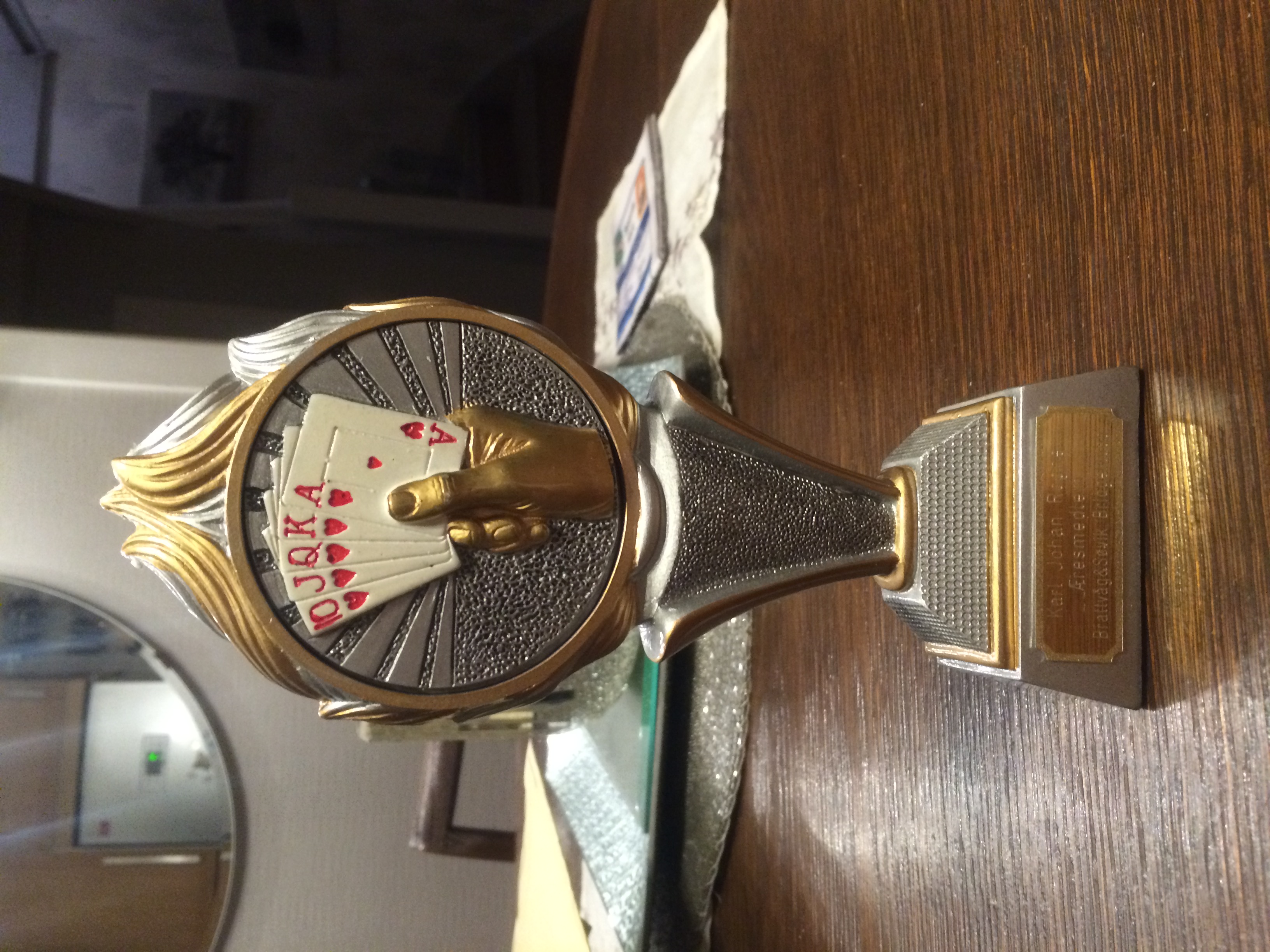V åpnet med 1 spar og makkeren meldte 2 spar uten at Lars og jeg meldte inn. Utspill fra N (Tom) var hj K og ny hjerter til S (Lars) sitt ess. Kl 8 til liten og 10-eren i N vant stikket. Ruter knekt dro konge og ess, men ru D stjal V. Nå ønsket spillefører å komme inn i bordet for så å få sak av en ny taper i kløver på ru 10 som sto. Kl K stakk Gjøs og innkasserte hj D der Helgesen fikk saket sin siste kløver. Liten kløver ble stjålet med trumf knekt men S kunne stjele over. Nå hadde allerede NS fått 7 stikk og fikk også til slutt stikk for sp 10 som hadde vokst til stikk! Ren topp for +300 til NS.
