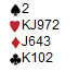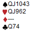 2 ruter var obligatorisk og 3 NT viste 24-25 hp. Vest medlte 4 kløver som Stayman, men Øst oppfatttet det som Gerber( ess-spørsmål) og svarte 4 NT som viste 3 ess. Vest oppfattet imidlertid 4 NT som Blackwood og svarte 5 kløver som viste 0 ess. Øst trodde fortsatt på Gerber og svarte 5 NT (3 konger ). Nå meldte Vest 6 ruter som var ment som overføring til hjerter, men Øst oppfattte det som farge og sa pass. Med ruter knekt velvillig plassert endte den ville ferden med kun 2 imps tap.