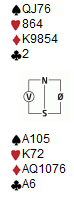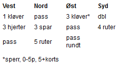 Sett deg som spillefører i syd, og legg en slagplan for 11 stikk i ruter etter kløverkonge i utspill fra vest. Lytt nøye til meldinger, og ikke legg en plan som ene og alene avhenger av hjerteress foran kongen.