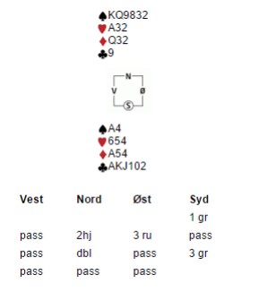 Dette spillet fra en lagkamp på BBO synes jeg var litt morsomt. Jeg ble som syd spillefører i favorittkontrakten 3 grand. Utspill fra vest var hjerter dame, som gikk til liten, kongen og liten. Øst fortsatte med hjerter 7 til liten, åtteren og esset Nå prøvde jeg spar til esset og mer spar. Vest la tieren på andre runde, imens øst saket enruter.