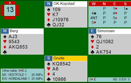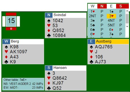 5-trinnet er vanskelig. Det er vel ingen av oss som har angret på aksjoner v har gjort. Tar vi ut er det feil og melder vi er det også galt. Her var det riktig å ta ut med vest sine kort. Konsekvensen er at de gangene øst sitter på beita i 4sp, må han passe fordi makker ofte tar ut. I alle fall de gangene han har llitt fordelilng. På det andre bordet gikk det likedan helt til doblingen. Der passet vest og måtte betale ut 590. Hvem at nord/syd som skal doble 5hj, vet jeg ikke. De har ikke peiling på om ØV sleminviterer eller stamper. Fin storeslem fra Berg - Austberg 3hj viser minst fem spar og 3sp viser trekort-støtte. Så forteller vest om tre av fem ess, kløverkongen og hjerterkongen. Det var nok for øst. Kontrakten er ikke nedlegg, men når kløverdamen falt tredje gang, var det tretten lette stikk. Spiller gikk ut i kampen mellom Vest-Agder og Hornslien når Brekka - Høiland også meldte 7sp I spillet under hadde Erik Berg uflaks for en gangs skyld. Her var det mange som kom til 6hj med EK i trumf vekk. Med sparkongen ut kan ikke 5hj vinnes heller fordi øst kommer ikke inn i tide til å få kvittet seg med spartaperen etter spar konge i utspill. Litt surt å vinne bare 1 IMP når motparten er i slem på andre bordet. Her sniffa Thomas Charlsen fint i 4hj. Trykk på spillet og velg spill 17.