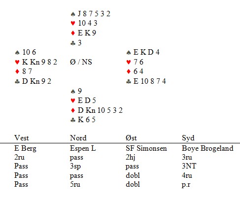 2ru er såkalt "Søppelmulti" og viser en majorfarge med dårlige kort. Steffen Fredrik Simonsen dobler for å få spar ut og da rømmer Boye. En svært tøff løft til utgang av Espen, men det så ut som det ikke var noe bortkasta i spar og singel kløver var jo bra?