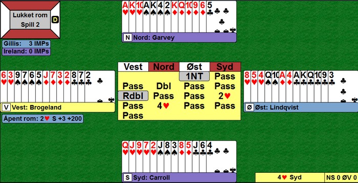 Heldigvis vinner Gillis 23 IMP på de to siste spillene. Det ene etter at irske ØV hadde to sjanser til å beite 3NT, en i utspillet og en i stikk to. Det klarte de ikke, mens Boye hadde et opplagt utspill fra KKn10xx på det andre bordet.