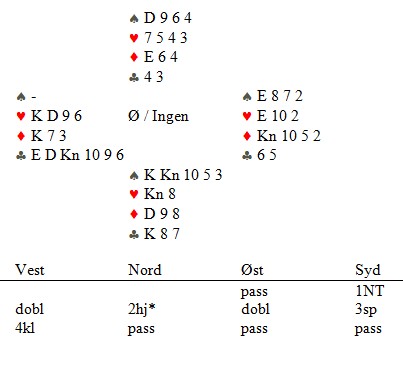1NT viser 8-12, mens 2hj er begge major. Karl Olav Hansens dobling er styrkevisende. Calle Knutsen fant ikke noe bedre enn 4kl og der døde det ut. Han fikk "bare" ti stikk, fordi han kappa på hjerter 10 siden nord hadde vist begge major. 3NT står når kløverkappen gikk, men også Kristiansand kom i delkkontrakt i kløver. 1 IMP siden de vant 11 stikk.