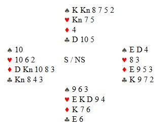 Undertegnede spilte spar til J og D, fikk ny hjerter og claim 10 stikk. Skiftes det kløver blir jeg tvunget til å slippe den til dama da det er trumf igjen ute så hjerter ikke gir avkast enda.