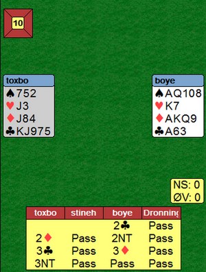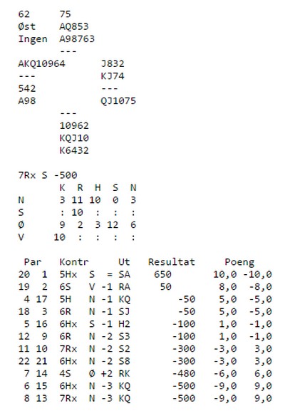 Se også stakkar par 6 og 8. Rett under kortfordelinga vises det "ideelle" resultatet for spillet. Eller med andre ord, den teoretisk beste prestasjonen for begge par på spillet. -500 på ØV er altså fasiten. Brigde er ikke rettferdig når -500 gir todelt bunn for det ene paret og todelt topp for det andre. Det er akkurat derfor bridge er så morsomt. Teori og praksis er to forskjellige ting.
