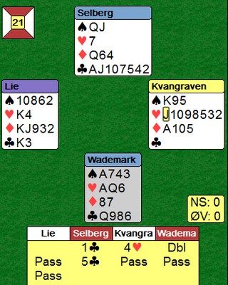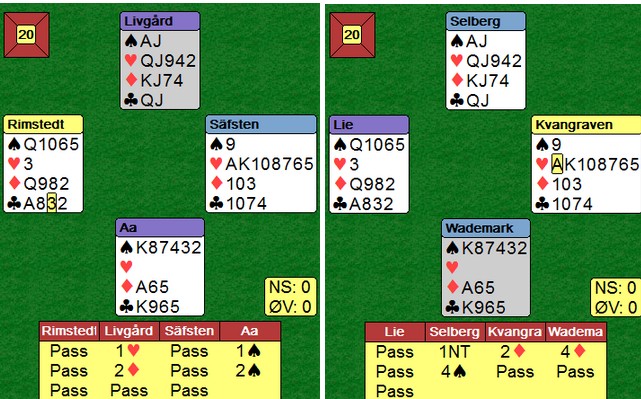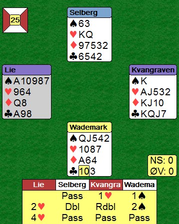 Jeg skjønner ikke helt hvorfor Terje Lie ikke dobler 2sp "på veien" til 4hj. Har makker en stor fordelingshånd, kan de alltids komme dit. Det ser ut som det er bare tre stikk i 2sp og 1100, men jeg tror han må få to sparstikk for "bare" 800 fordi ØV må spille spar for å hindre hjerterstjelilga i bordet. Da tror jeg syd må få for både damen og knekten etter hvert.