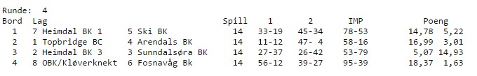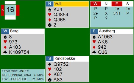 RESULTATER KAMP 4 Heimdal 1 er i siget og tar en fin seier mot Ski. Denne runder var det OBK/kløverknekt som hadde hjemmelaget og de scoret 18,37. En fin seier til både Topbridge og Sunndalsøra. Det jevner seg ut i toppen!! Hadde du klart denne? Spar ut til kongen. Ser du vinnervarianten? Du kan ikke stikke den første, fordi da kommer syd inn på kløveresset og spiller en liten spar til makkers knekt. Øst sin tier blir så gjennomspilt. Du han heller ikke lasje to ganger fordi da blir syds spar godspilt i tredje runde med kløveresset som inntak. Ergo: Lasj den første og stikk den andre! Om dette er teoretisk beste plan er jeg lang fra sikkert på, men en litt uvanlig variant. En glimrende meldt slem av Jan Tore Berg og Per Erik Austberg Det kan virke som Jan Tore i syd ombestemte seg over 3NT. Det er mulig 3sp betyr noe, men ellers ser det naturlig ut å støtte ruteren med en gang. Kanskje det viser bedre kort å melde 4ru direkte, mens dette er en begrenset hånd med ruterstøtte? Men dette går ikke av landslagspar.. De skylder sikkert på hverandre, men storeslemmer uten alle ess går det ikke an å gjette seg fram til. For meg virker dette sinnsykt hardt av Jan Tore Berg å melde 7sp over 7hj . Makker trenger fire nøkkelkort, EK i spar og minoressene. I alle fall kunne han passet og vist interesse. Husk at allerede 5NT var ingen undermelding.