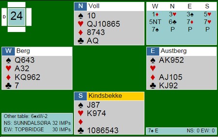 Likevel ga dette en 5'er i pluss. Jan Mikkelsen i det andre rommet avga en flott Lightner-dobling allerede på 6sp. Makker Jon Egil Furunes spilte ut ruter til stjeling, kløver til esset og nok en ruter til stjeling for 300 i beit. Sånne lagkamerater vil jeg også ha!