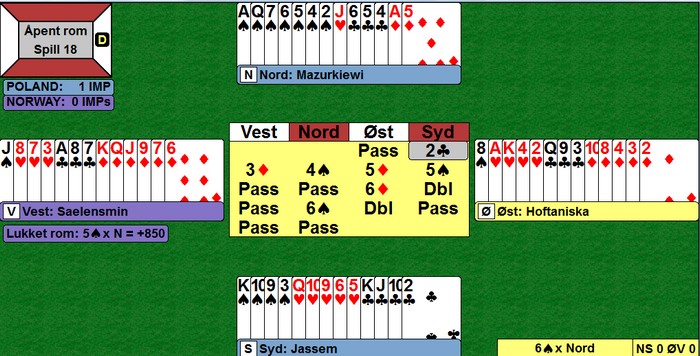 Hoftaniska - Sælendsminde var ankerpar for de norske, så svingen var faktisk dobbelt så stor. Svindahl - Hansen var også i 6sp (!) med EK i hjerter ut. De vant sine 12 stikk på like mange sekunder. +17 IMP i den kampen.