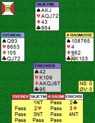 Jeg er aldri noen tilhenger av å melde NT uten hold i motpartens farge, men alternativene var verre for Sverre Johnsen. Spar ut til damen, hjerter til knekten og mer spar til esset. Nå bomma øst ruter med en liten til damen og en ny til nieren. Fire spar stikk, fire hjerterstikk og EKn i ruter ga fire sonebeiter. På den andre hånda kommer sparkongen ut og da er en MYE lengre. Treffer en minorfargene, kan det vinnes åtte stikk.