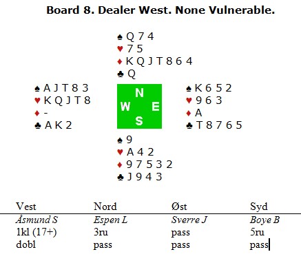 5ru gikk 300 i beit, mens sponsoren kom i en helt ok 6sp, men gikk beit da han naturlig nok ikke kappa trumfen gjennom sperremelderen. Nok en stor sving mot Boye og Espen.
