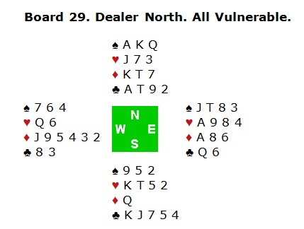 Spar esset og skift til kløver. Hjerter til esset og ruter. Du må stikke med esset og spille mer trumf. Jeg vet ikke om det er rett hver dag hele året, men i alle fall denne gangen når Åsmund Stokkeland kappa på nieren og stjal en ruter hjem. Alt NS fikk var ruter ess og sparesset. Et stor tapsspill siden Mahaffey var i 3kl på det andre bordet.