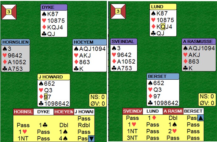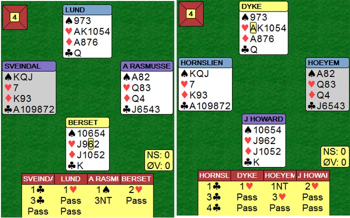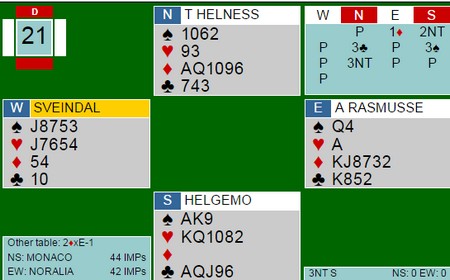 Her har jeg forståelse for Høyem som spør etter hjerterhold hos makker. 3NT står fordi EK i hjerter sitter foran og kløveren 1-1. En heldig utgangssving til Noralia som leder kampen på dette tidspunktet.