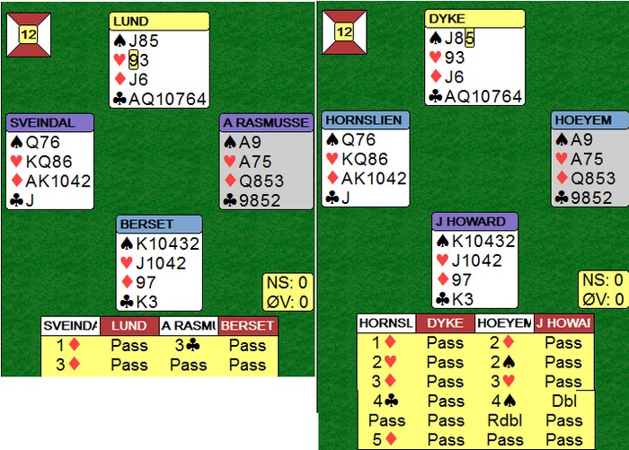 Jon Sveindal har lykkes tidligere med å gjette hvem som har kortene i spillet. Når han åpner med 3ru håper han at det er nord som har en sterk hånd, men denne gangen var det makker som hadde mer kort enn han ønsket. Aksel Hornslien åpner med en normal 1ru og finner den fine hjerterutgangen. 3ru i andre melderunde var ikke akkurat noen undermelding, Aksel? 4hj spiller seg ikke selv heller, men Høyem vant sine ti stikk.