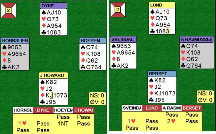 1-0 til femkort major. Arild Rasmussen har en oplagt 2hj, mens Olav Arve Høyem melder 1NT siden makker kan ha bare fire hjerter. 1NT går beit, mens 2hj vinner lett.