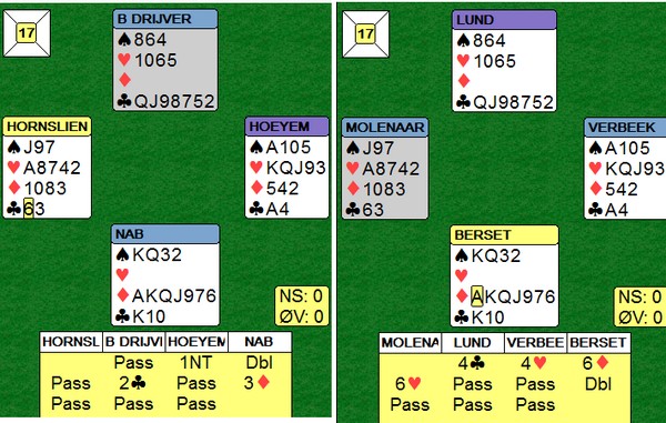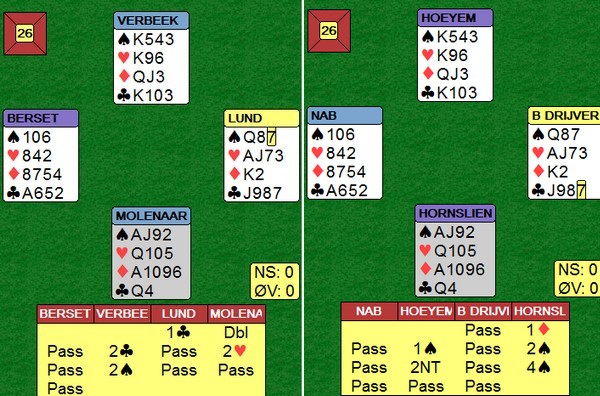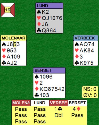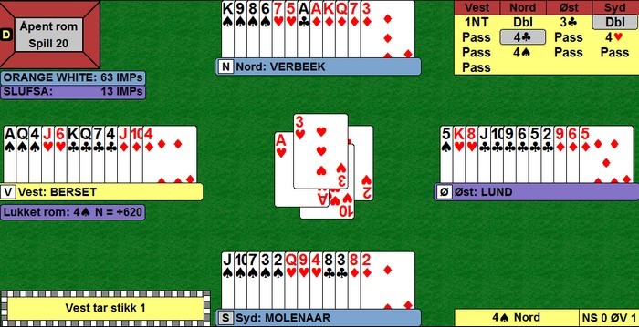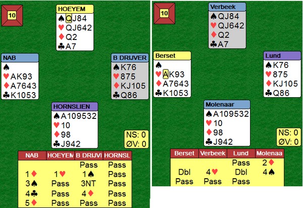 På det andre bordet spiller nederlenderen ikke så bra. Han stikker kløveren og fortsetter med spar ess og spar til stjeling. Så kløver mot bordet, men Børre bare stikker og spiller trumf til bordets ess. Kløverknekten kan Ole i syd stjele og de ti stikkene har blitt til ni.