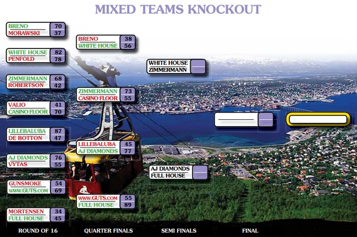 Jeg fikk sett en del av den første sesjonen av kampen mellom norsk/svenske GUTS.COM og svensk/amerikanske FULL HOUSE i kvartfinalen. Det var lovende takter av de norske og ledelse med 41-32. For de andre to norske eller halvnorske lagene så det mørkere ut. CASINO FLOOR (Thomas & Hoffa) r hadde fått bank av Zimmermann, mens LILLEBALUBA (MO BK) lå godt bak sin motstander.