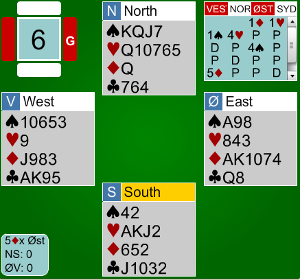 I lagbridge er det de store spillene som avgjør og dette er et sånt et fra kampen mellom GUTS.COM og FULLHOUSE. Norske Pernille Lindaas og Jørn Arild Ringseth sitter ØV og melder seg opp i en absolutt spillbar 7sp. Jeg skjønner godt at Jørn i øst melder storeslemmen og var ikke spesielt heldig med makkers single ruter.