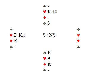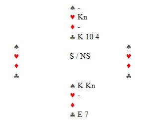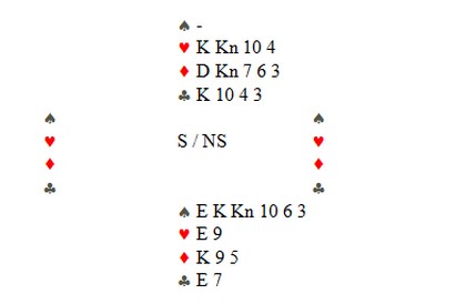 er egnentlig ikke veldig annerledes, men her må du passe på begge motstandere. Prinsippene er akkurat de samme. Du må ha justert tempoet slik at du mangler ett stikk og du må ha kommunikasjon mellom hendene. Plasseringen av truslene er det som er litt mer komplisert, fordi du må passe på at hver av motstanderne har minst en av truslene bak seg. Det samme kortet er som regel en trussel mot begge motstanderne, men det kan fungere som trussel foran den ene og bak den andre.