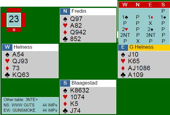 Kløver ut til esset og ruter til ED. En beit og 11 IMP ut mot 3NT - 11 stikk.