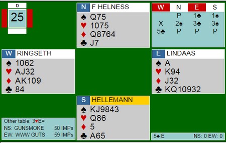 Jeg vet ikke, men kanskje er 3ru en like god melding som 4hj, Gunn? Tredje farge viser hold og da får makker omtrent den samme informasjonen om at hjerteren er øst sitt svake punkt. Dere er enda under 3NT og har ikke brent de samme broene som 4hj gjorde? Likevel, maks uheldig da!!