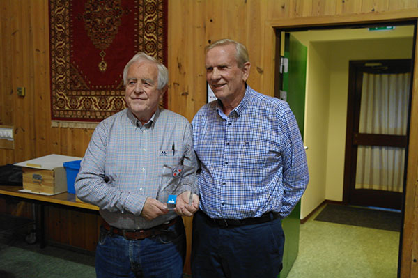 Fra utdelingen i Fredrikstad Bridgeklubb på spillekvelden 6. okt, den dyktige vinneren til venstre sammen med Knut Kjærnsrød fra styret i Norsk Bridge Presse.