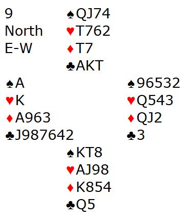 Spilleføringen var over på sekunder. Om ruteren hadde vært gående som den jo nesten alltid er med slik farge ville det vært 17 stikk! Men med kun tre ruterstikk var det akkurat 13 stikk. Merk at det slik det sitter er håpløst i 7 ruter med en trumftaper. Motstanderlaget var i nettopp den kontrakten med en bet, ganske uheldig må man ha lov til å si. Pluss 2220 sammen med +100 ga lag SMILE den hyggelige uttellingen 20 IMP!
