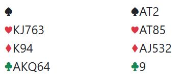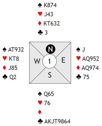 Her viser øst sitt hopp til 4 kløver firekorts trumf og singel kløver. Nå vet vest at de skal til 6 eller 7 hjerter og kan like godt spørre med det samme om nøkkelkortene (essene, trumf kongen og trumf damen), helst med 4 spar som Exclusion Key Card Blackwood siden spar ess antagelig ikke er så interessant. Det mangler ikke nøkkelkort, men trumfdamen mangler. Det kan vel likevel være fristende å satse på 7 hjerter som mest sansynlig avhenger kun av at trumfen ikke gir taper?
