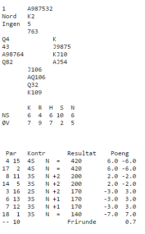 8 bord og 16 stort sett nye parkombinasjoner gjennomfølrte 24 spill under - selv med noen dataproblemer - fin ledelse av Terje Jørgensen.