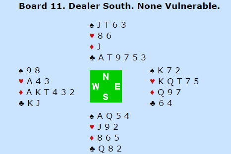 (ved det andre bordet spilte Norge 4 hjerter av vest etter grandåpning og overføring. Etter ruter knekt i utspill ble det elleve stikk, +450, men 1 IMP til Italia)