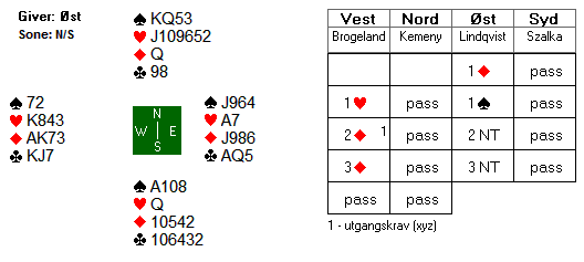 Allerede i spill 2 var det duket for en utgangssving i norsk favør. Kontrakten var 3 grand på begge bord. Det var totalt fem toppstikk i hjerter og kløver. Skulle det være noe realistisk håp om hjemgang trengte du aller helst fire ruterstikk på EK73 mot kn986. Hvordan ville du spilt denne farga uten at motparten hadde meldt noe?