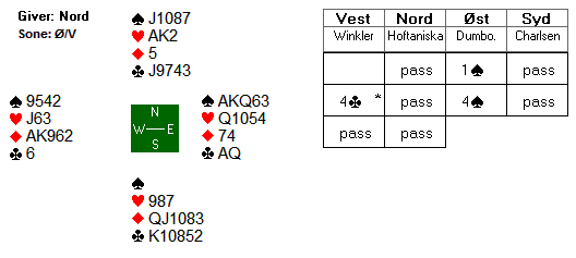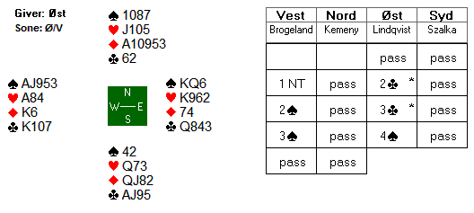 Etter litt slit spilte Dumbovich hjem 4 spar. Da ungarerne var med til 5 kløver ved det andre bordet valgte Espen å melde 5 spar. Etter at Boye hadde meldt 4 spar over 2 NT kunne det da godt være spill for 5 spar. Det hadde det da også vært om det ikke hadde vært for at sparen satt 4-0.