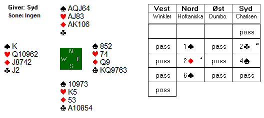 Hvis kløveren gir fem stikk er man alltid hjemme. Den andre hovedsjansen er hjerterfinessen. Aktuelt spilt Thomas kløver til dama og la deretter ned kløveress. Han måtte da gi bort et kløverstikk, men det ordna seg da hjerterdama satt i kutt. Vi ser med åpne kort at kløveren kan løses uten taper ved å spille kløver knekt fra hånda, men det trenger jo selvsagt ikke være riktig. Til syvende og sist ble man i praksis avhengig av hjerter finessen. Det satt fint og dermed hjemgang i en fair lilleslem.