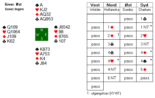 De to spilleførerne valgte ulike linjer. Mens ungareren Winkler gikk for dobbeltfinessen la Espen Lindqvist ned esset. Da dama satt singel bak ess-konge kunne man fiske opp tieren etterpå for fire ruterstikk og vunnet utgang. 10 imp til Norge.