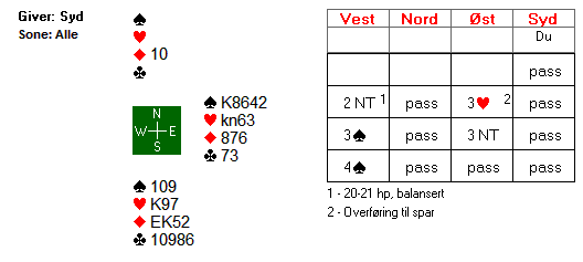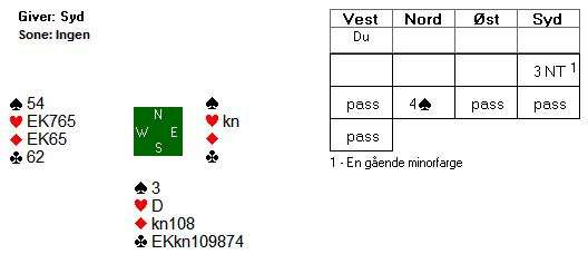 Dette spillet er et lærebok-spill. Ingen av spilleførerne på tirsdag klarte prøven, men den har et enkelt spillepoeng som også klubbspilleren fint kan mestre. Du sitter i syd og skal spille 4 hjerter etter et uforstyrra meldeforløp. Ut fra vest kommer en liten ruter: