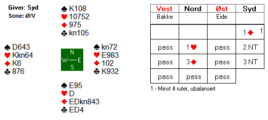 Christian Bakke fant den geniale fortsettelsen av hjerter konge som felte spilleførers single dame. Deretter kunne han ta for knekten før han fortsatte med hjerter gjennom bordet tier. Makker Harald Eide kunne ta beita på ess-ni i hjerter.