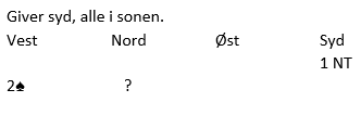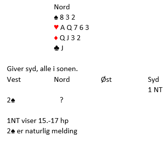 Meld 3 hjerter. Det er overføring rett inn i motpartens farge, og det bruker vi som spørsmål om stopper (= har til utgang, men vet ikke hvor).