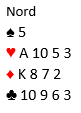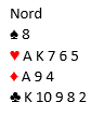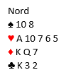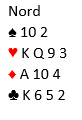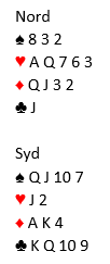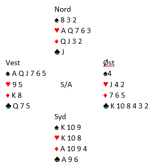 Her (slik kortene faktisk så ut da spillet forekom) er 4 hjerter spilt av syd en overlegen kontrakt. Selv meldte jeg 3 hjerter, og makker løftet til 4 hjerter. Kontrakten var kommet på feil hånd.