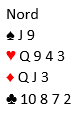 Etter standard (gammeldagse?) metoder melder nord 3 hjerter - naturlig og krav. Det kan være et alternativ å bestemme seg for 4 hjerter, men det kan godt bli helt feil da 3 grand kan være beste sluttkontrakt. Å doble negativt kan også føre frem, men makker vil neppe melde hjerter uten at han har firekorts farge, og vi risikerer dermed å ikke finne 5-3 tilpasningen. Å melde 3 spar for å spørre om sparstopper er også en mulighet. Men da finner vi heller ikke ut om det er hjerterkontrakt vi skal spille, og det kan godt være tilfelle selv om makker har sparstopper. N/S sine kort kan for eksempel se slik ut: